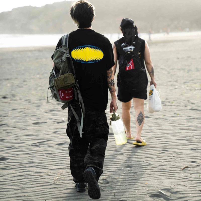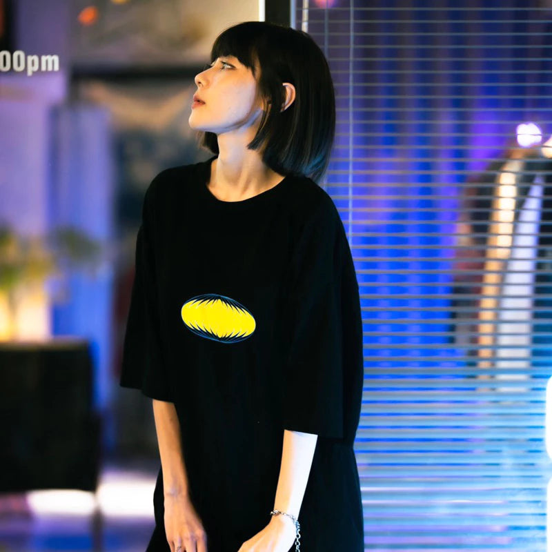 ما يميز هذا القميص هو إمكانية ارتدائه على الوجهين، ما يمنحكِ حرية ارتدائه حسب مزاجكِ ومناسبتكِ. يحمل الوجه الأمامي شعار العلامة التجارية "الثقب الدودي" مع زخارف صفراء زاهية لإضفاء لمسة منعشة وخفيفة؛ ويحتوي الوجه الخلفي على بطاقة ترويجية صفراء لحفلة عيد ميلاد، مليئة بالمفاجآت.